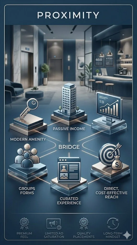 The idea came from firsthand experience walking through apartment buildings and noticing untapped, high-traffic areas—lobbies, mailrooms, elevators—where residents pass through every single day, yet nothing meaningful was being communicated. At the same time, local businesses were struggling to reach nearby customers in a direct, cost-effective way. Proximity was created to bridge that gap.